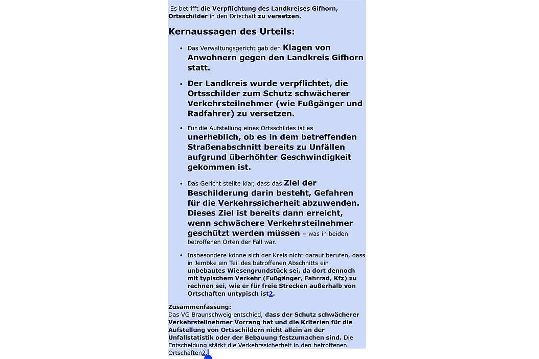 Die Richterinnen und Richter der 6. Kammer gaben den Klagen nach einem Ortstermin in beiden Ortschaften statt. Die fraglichen Straßenabschnitte in Eickhorst und Jembke gehören nach den Urteilen bereits zur geschlossenen Ortschaft, sodass die Ortsschilder entsprechend versetzt werden müssten. Eine geschlossene Ortschaft beginne bereits dort, wo eine zusammenhängende, von der Straße aus erkennbare Bebauung vorliege, aus der sich „ortstypische Verkehrsgefahren“ ergeben können und die an die Straße angebunden sei.
