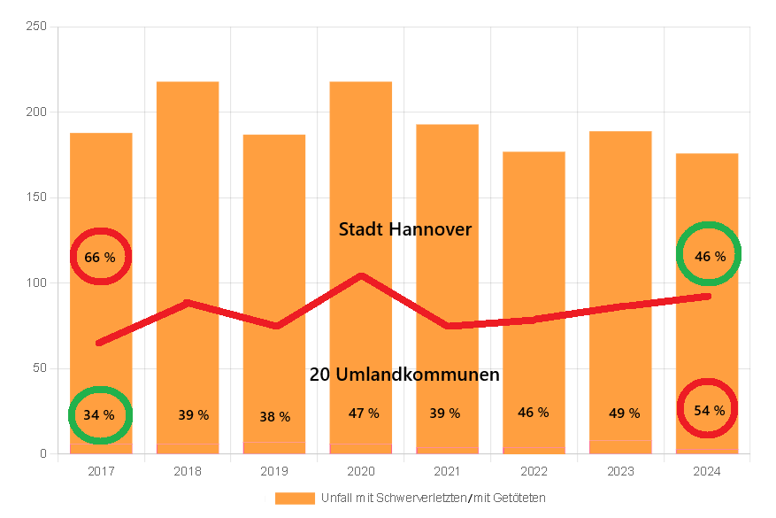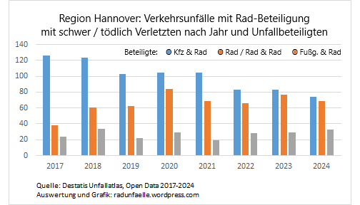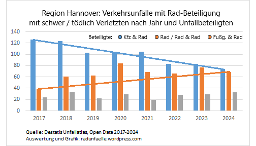 2017 bis 2024: Nur SEHR geringfügig weniger schwere Verkehrsunfälle mit Radbeteiligung in der Region Hannover: Erfüllt die Region Hannover DAMIT ihre Auflagen aus der Vorschriftenlage für die "Vision Zero"? © ADFC Langenhagen. - Daten: Unfallatlas DESTATIS. - Graphik: https://fahrrad-unfallorte.de/03/2/41//fahrradunfaelle