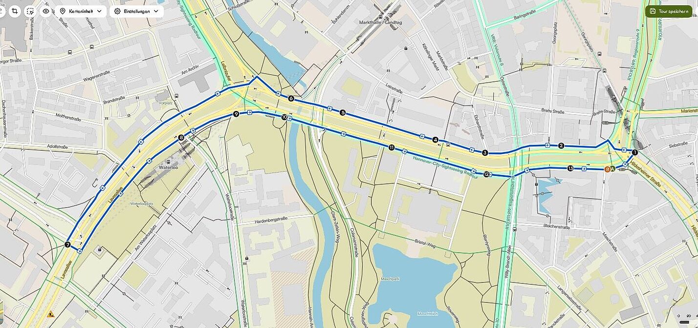 - die obige Radfahrstecke wird virtuell ab Theater am Aegi entgegen dem Uhrzeigersinn angefahren.