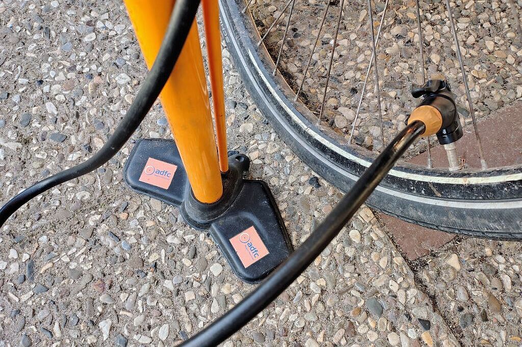 - oder einfach vorbeikommen, auf eigenes Risiko … - großvolumige ADFC-Luftpumpe mit viel Hubraum und Manometer